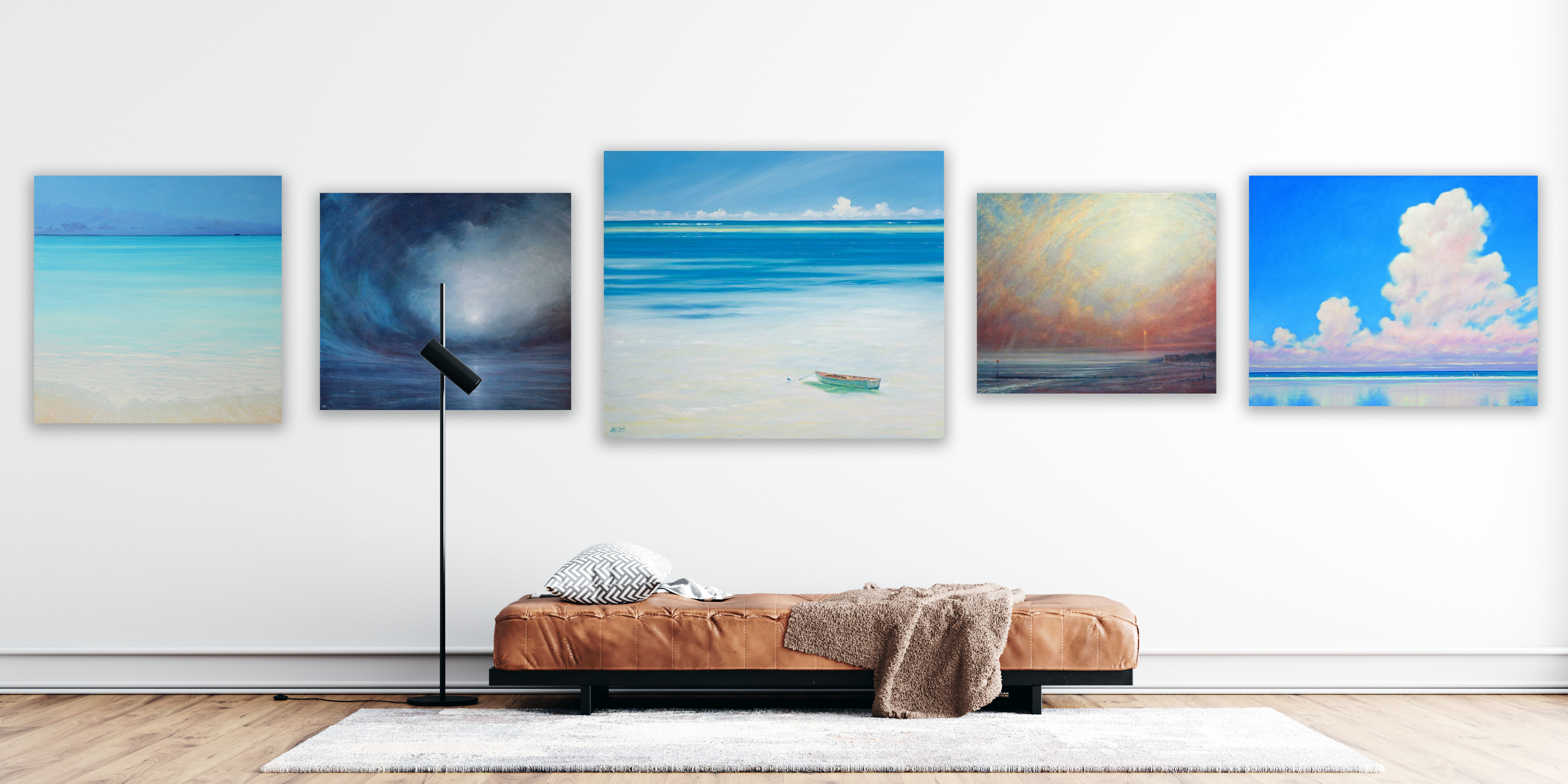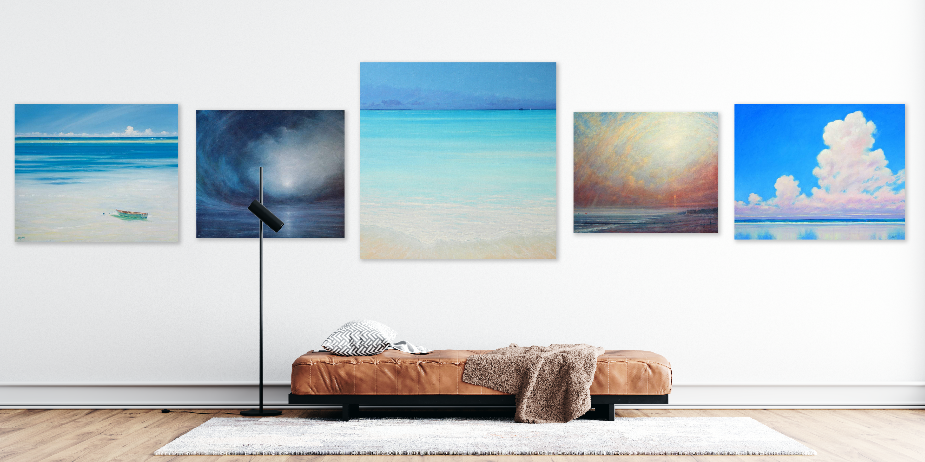 I find that the air is most often clearer on a shoreline or in areas close to the coast, and this has immeasurable effects on the quality and clarity of the light. A small focal point, in the form of figures, sailboats or other features, add a sense of scale to otherwise empty canvasses. This further imbues the painting with a stillness and feeling of peaceful solitude. The difference between painting in northern Europe, in the North Sea or Baltic, and the warmer waters of the Indian Ocean or Caribbean, apart from the climate, is the total variation in the light, as it changes hour by hour.