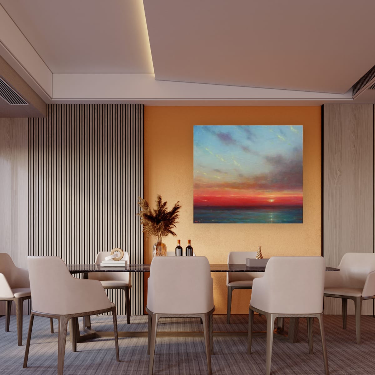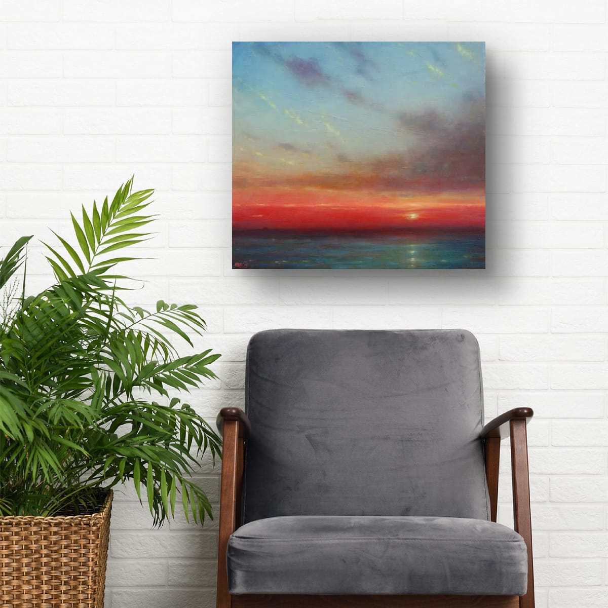 As dawn breaks over the Sea of Abaco, the first light of day shimmers across calm, glassy waters. From the stillness of a boat at Treasure Cay, the rising sun paints the horizon with soft golden tones, capturing the tranquil beauty of the Bahamas. This original seascape oil painting reflects the serenity of island life — a moment suspended in time where light, sea, and sky meet in perfect harmony.