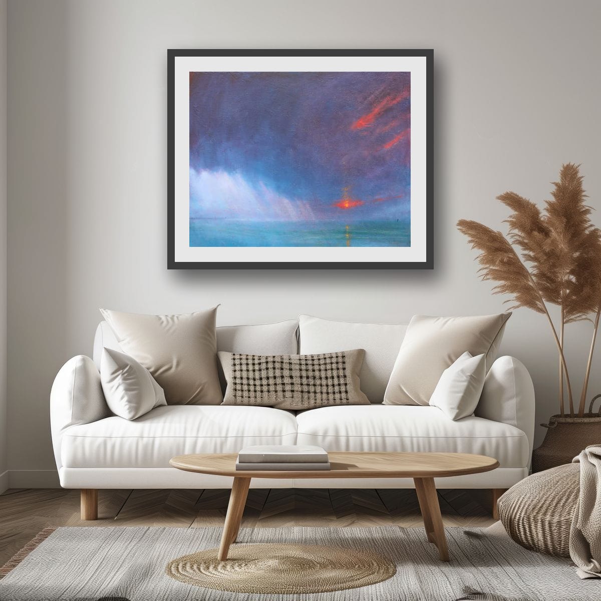 An evening sunset storm passes over the shoreline, and, as the sky clears, the pier at the harbour mouth is revealed.